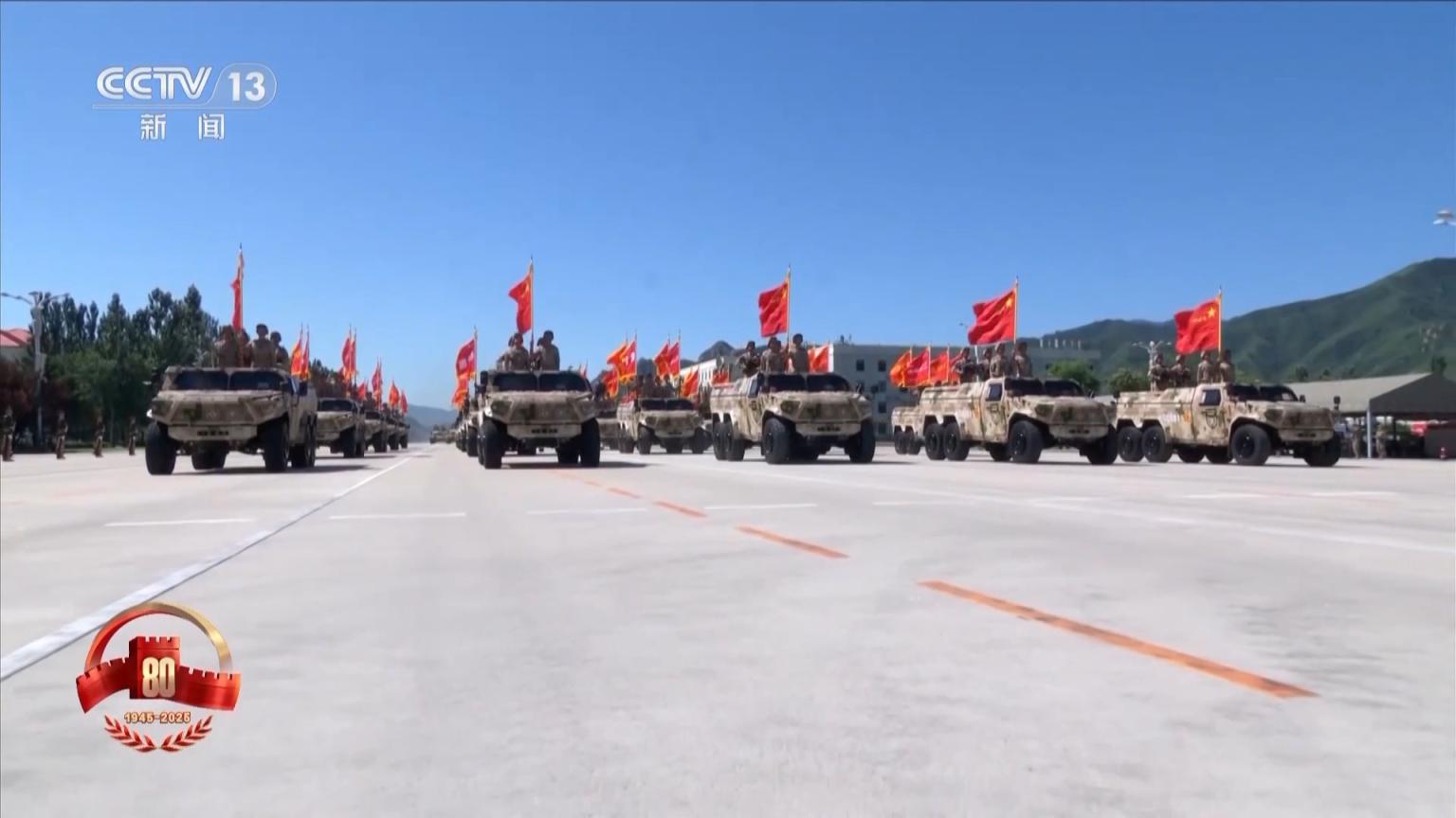战旗方队,由25辆新型猛士突击车组成,车上搭载的荣誉战旗,都是从八路军、新四军、东北抗联、华南游击队等授称(命名)单位中遴选,是我军在抗日战争时期艰苦卓绝战斗的缩影,承载着我军抗击日寇、抵御侵略的苦难辉煌。